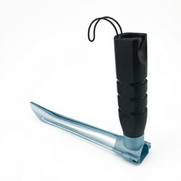 - The distal end of the laryngoscope is shaped like a rounded “V” for enhanced visualization.